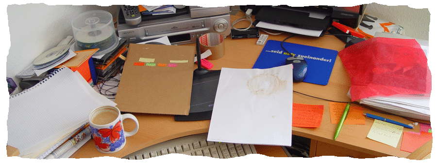 | Dieses Bild zeigt meinen eigentlichen Arbeitsplatz. Entschuldige bitte diese Unordnung. Normalerweise sieht es auf meinem Schreibtisch nicht so aus.^^ Die Pappe in der linken Bildhälfte mit den bunten Klebezetteln drauf ist übrigens das Layout, welches du gerade vor dir hast. Unter dem roten Krepppapier ganz rechts, versteckt sich mein Notizbuch mit all meinen Ideen. Ganz wichtig ist auch die Tasse Kaffee für mich, denn ohne Kaffee läuft beim Tüfteln und Werkeln nichts. ;-) |